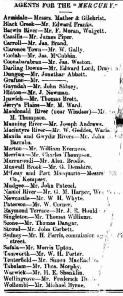 The evidence of this orientation towards the far-flung regions of NSW is clear from the Mercury’s list of its ‘agents’ in 1852. It was an indicator of the ‘trade area’ or ‘hinterland’ of Maitland at that time.